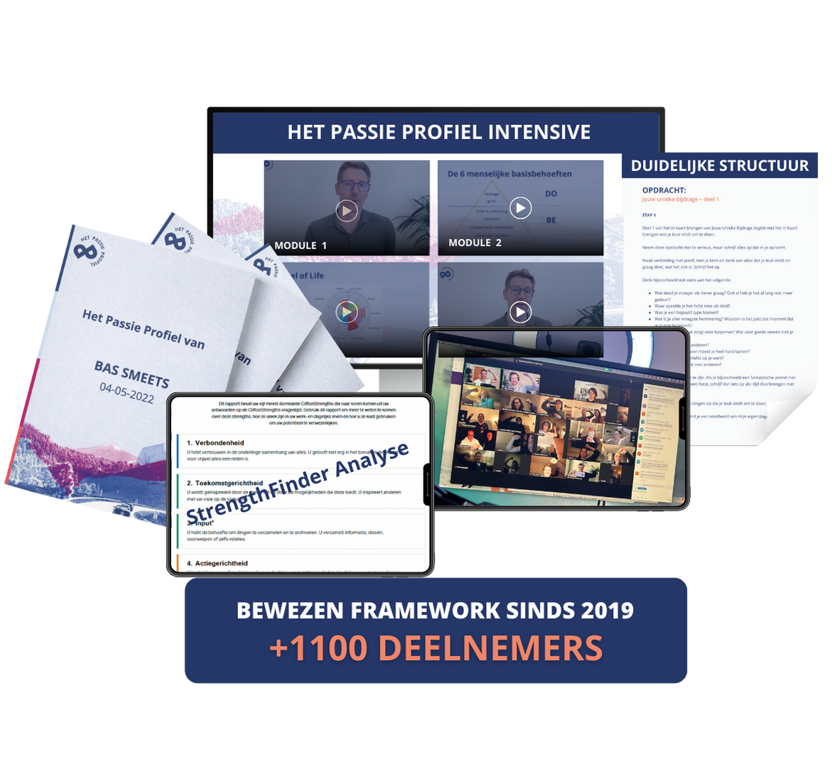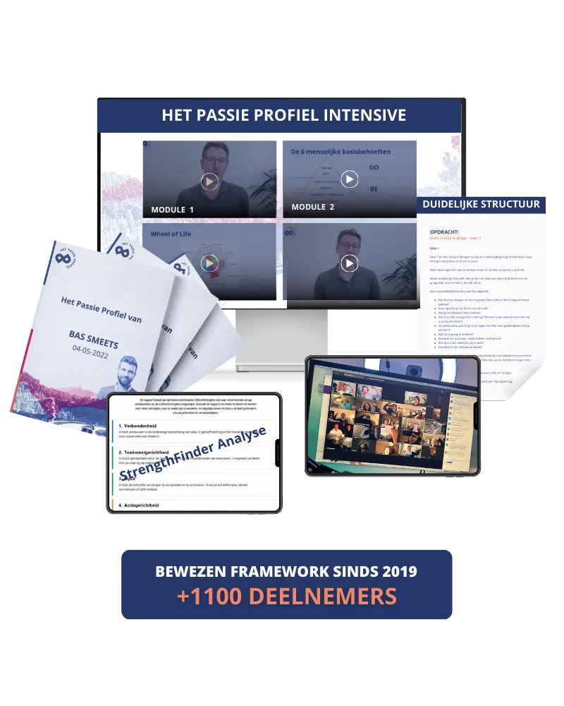 ✓ Het Passie Profiel Leeromgeving (waarde €1197) 6 praktische modules die je stap voor stap begeleiden van verwarring naar helderheid. Een jaar toegang tot alle materialen. Dit is exact hetzelfde materiaal als ons normale 1-op-1 traject.